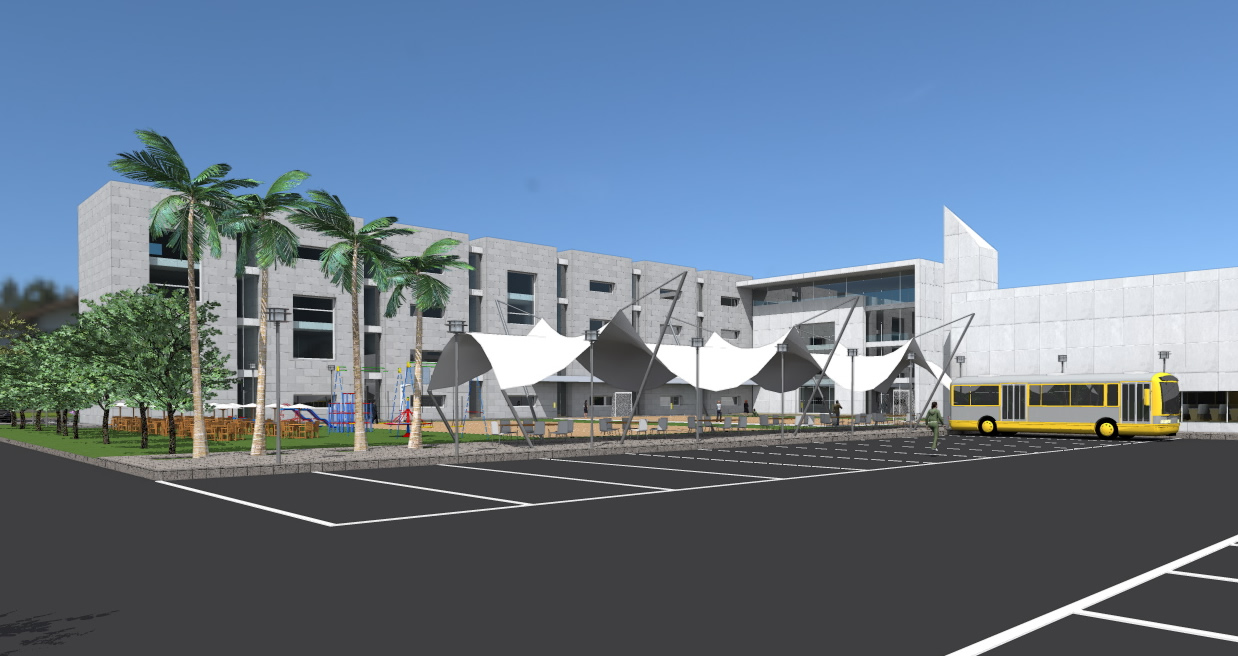 Outdoor parking, visitors and school buses, Parkland, Water mirrors.